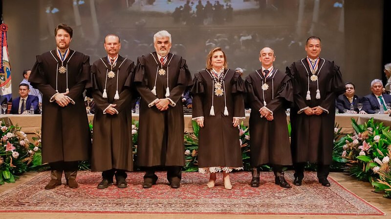 Conselheiros do TCE-AM em cerimônia de posse da conselheira Yara Lins para a presidência no biênio 2024-2025. Da esquerda para a direita: conselheiros Luís Fabian, Mário de Mello, Julio Pinheiro, Yara Lins, Érico Desterro e Josué Neto (Foto: Reprodução/TCE-AM)