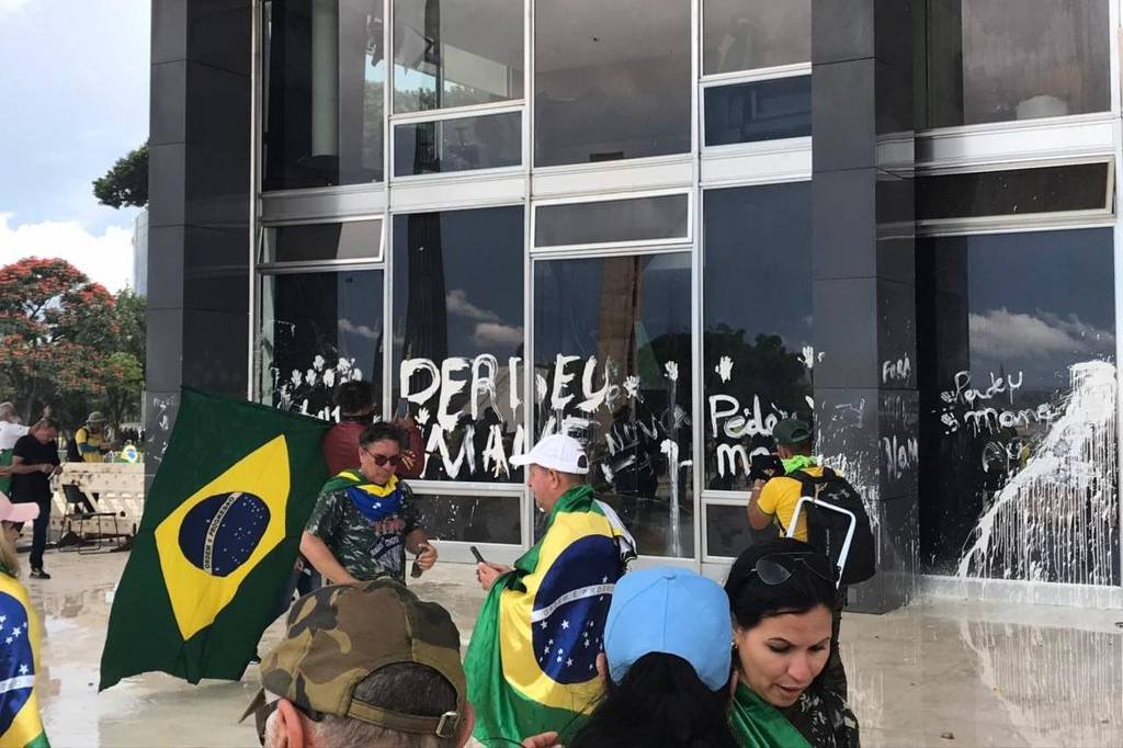 O rastro de destruição se repetiu no Supremo Tribuna Federal e no Palácio do Planalto. No STF, os invasores escreveram frases em vidraças do prédio como “Destituição dos Três Poderes” e “Perdeu Mané”, que faz alusão à frase usada pelo ministro Luís Roberto Barroso, após sofrer hostilidades por um homem em Nova York.
