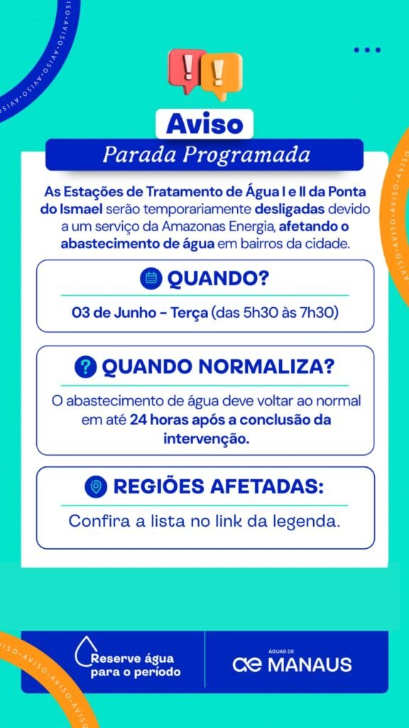 MANAUS (AM) – Mais de 300 comunidades de Manaus terão o fornecimento de água temporariamente suspenso nesta terça-feira, 2/6, devido a uma manutenção programada da Amazonas Energia.
