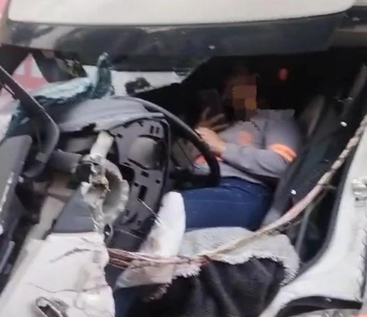 A colisão ocorreu após a carreta da frente frear bruscamente e, com o impacto, o veículo que vinha atrás não conseguiu parar. A frente da carreta ficou destruída com o impacto.
