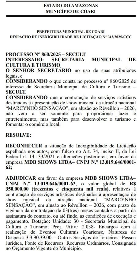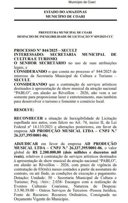 MANAUS (AM) – A gestão do prefeito de Coari, Adail Pinheiro (Republicanos), vai gastar R$ 2,9 milhões na contratação de artistas nacionais para as atrações do Réveillon 2026 do município. As informações foram divulgadas no Diário Oficial do Município (DOM).