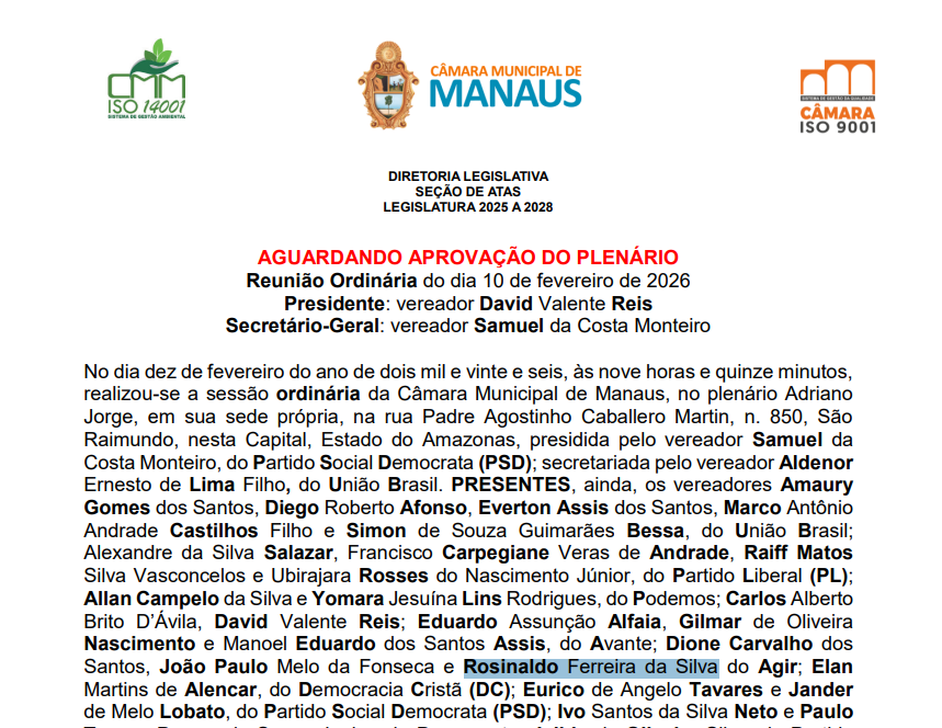 MANAUS (AM) -O vereador Rosinaldo Bual (AGIR) voltou a registrar presença nas sessões da Câmara Municipal de Manaus (CMM). O nome do parlamentar consta nas atas das sessões legislativas, indicando participação no Legislativo municipal, algo que não ocorria desde outubro de 2025, quando ele foi preso e afastado do cargo por 120 dias.