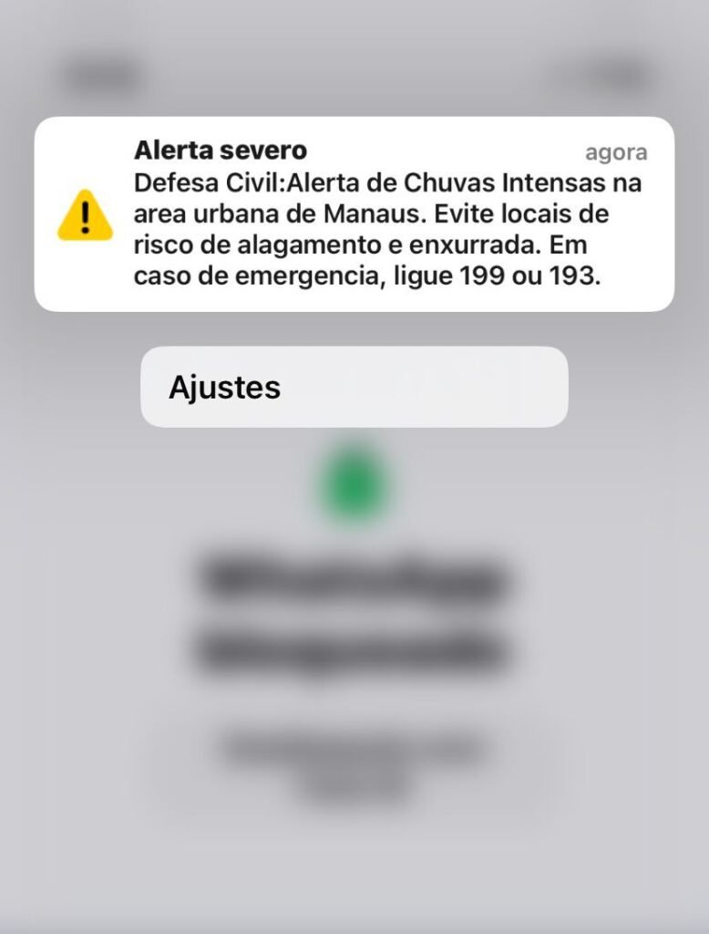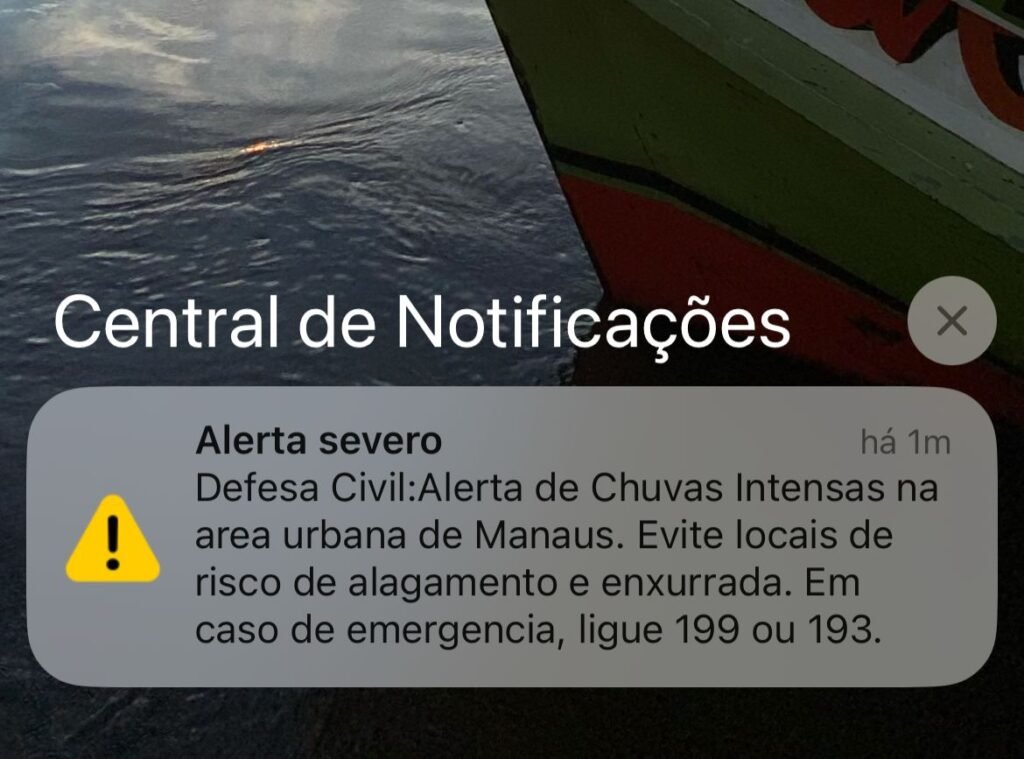 MANAUS (AM) – Muitas pessoas receberam em seus celulares, na tarde deste sábado, 29/11, um alerta da Defesa Civil sobre a possibilidade de tempestades, chuvas intensas, enxurradas e alagamentos em Manaus e em alguns municípios do Amazonas. A mensagem, classificada como de Nível Severo, é válida somente para este sábado.
