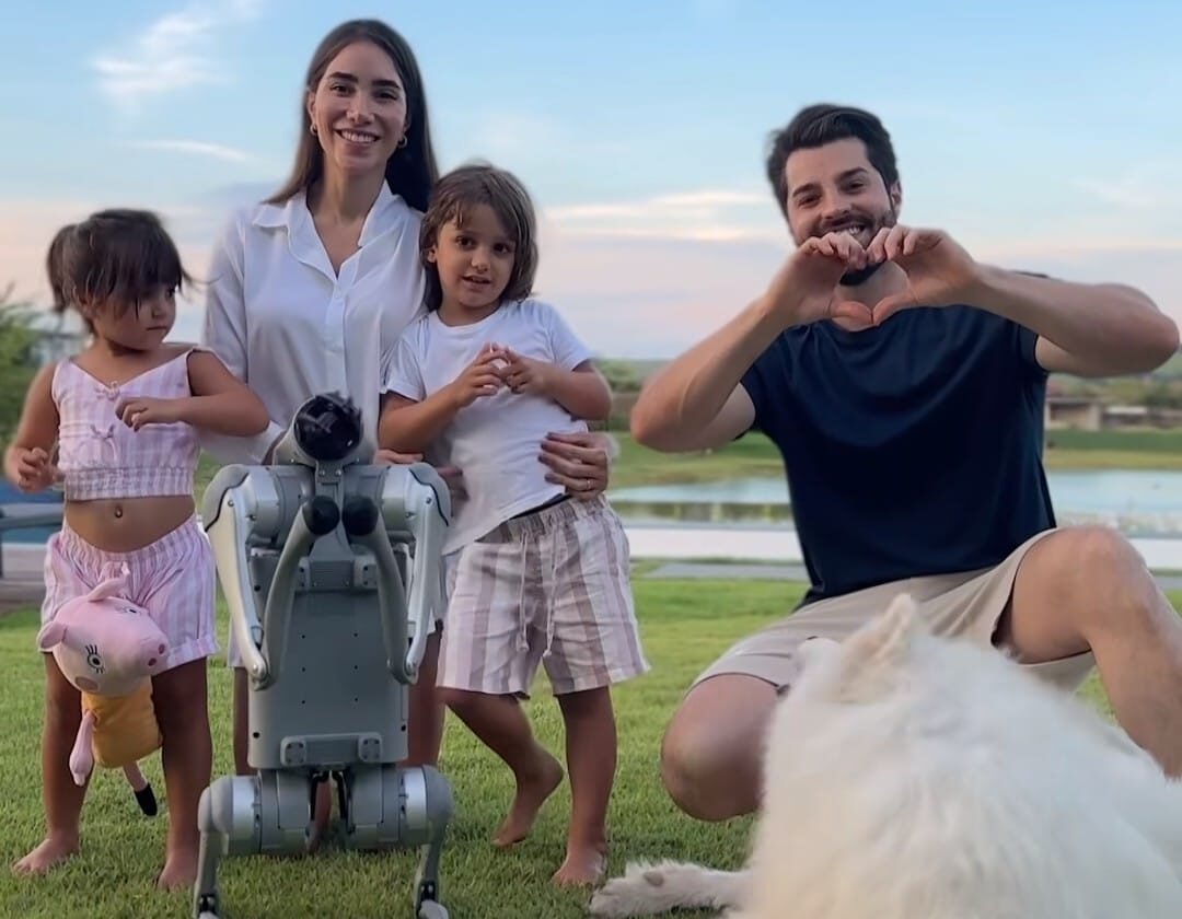 Nas imagens, o cachorro robô aparece interagindo com a mulher de Alok. Romana Novais, os filhos Ravi e Raika, além do (outro) pet da família, o Apollo, um cachorro da raça Samoieda.