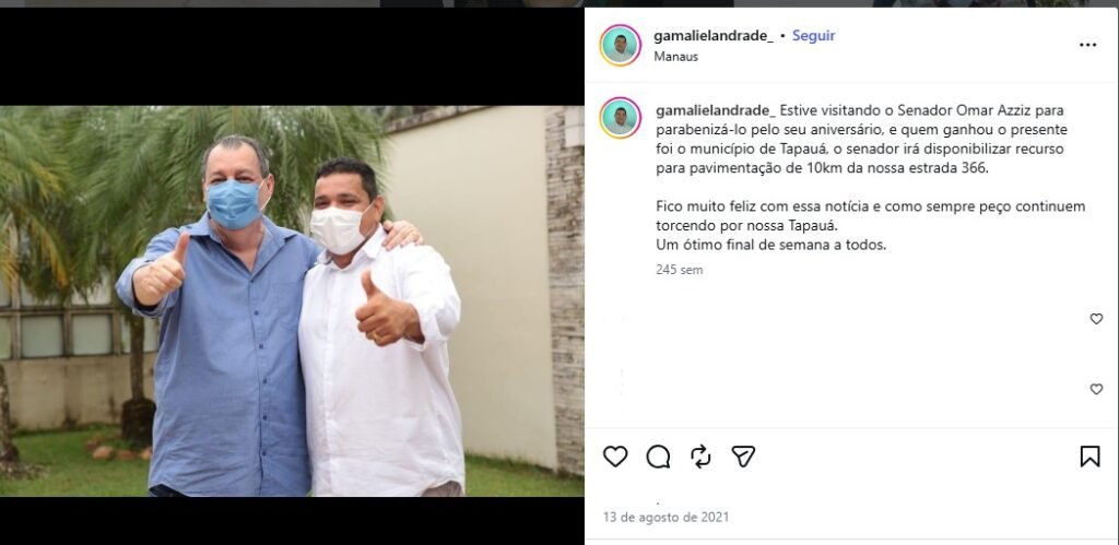 Ainda segundo o levantamento, em agosto de 2021, o prefeito divulgou nas redes sociais uma foto ao lado de Omar Aziz para anunciar a destinação de verbas voltadas à pavimentação da rodovia estadual.