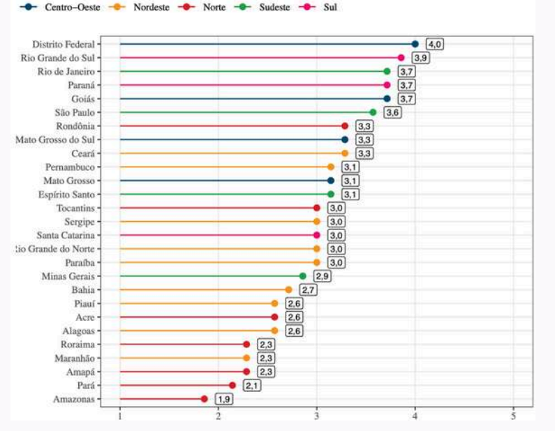Enquanto o Distrito Federal lidera o ranking com a melhor pontuação (4,00), seguido pelo Rio Grande do Sul (3,86) e por Goiás, Paraná e Rio de Janeiro (3,71), o Amazonas aparece na última colocação, com apenas 1,86 pontos.