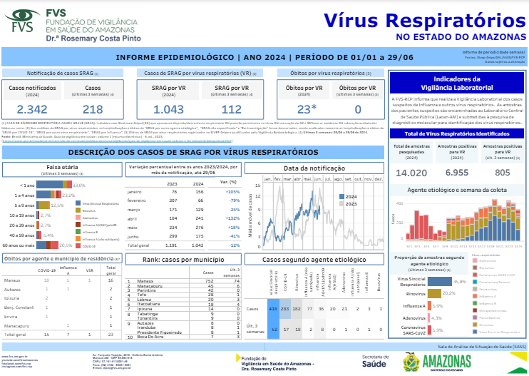 Desses 2.342 casos notificados de SRAG, foram 1.043 por vírus respiratórios, sendo 112 nas últimas três semanas. Ainda em 2024, até 26 de junho, foram registrados 23 óbitos por vírus respiratórios. A faixa etária mais atingida são crianças menores de 1 ano (33%); 1 a 4 anos (23%); mas há também ocorrência de em pessoas com mais de 60 anos de idade (20%), Segundo a Secretaria de Estado de Saúde do Amazonas (SES-AM)