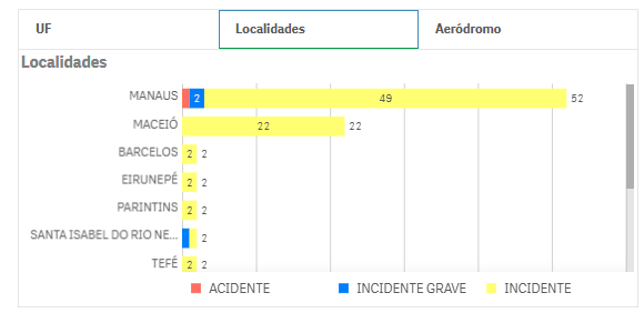 O Amazonas registrou 67 ocorrências aérea: das 62 ocorrências classificadas como incidentes no estado, 43 foram relacionadas a falhas ou mau funcionamento das aeronaves. Colisões com aves totalizaram 13 casos, e dois incidentes ocorreram durante operações no solo.
