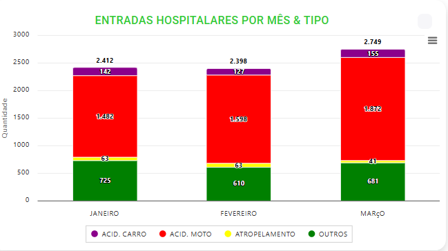 Entre os principais registros, acidentes com motocicletas lideram em todos os meses, com 4.952 ocorrências. Em seguida aparecem acidentes de carro, com 424 casos; atropelamentos, com 167; e outros registros, com 2.016 atendimentos.