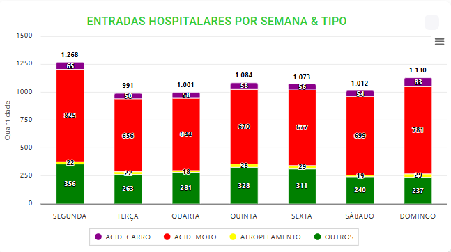 Os dias da semana com maior número de registros de casos foram a segunda-feira, com 1.268 ocorrências, seguida pelo domingo (1.130), quinta-feira (1.084), sexta-feira (1.073) e sábado (1.012).
