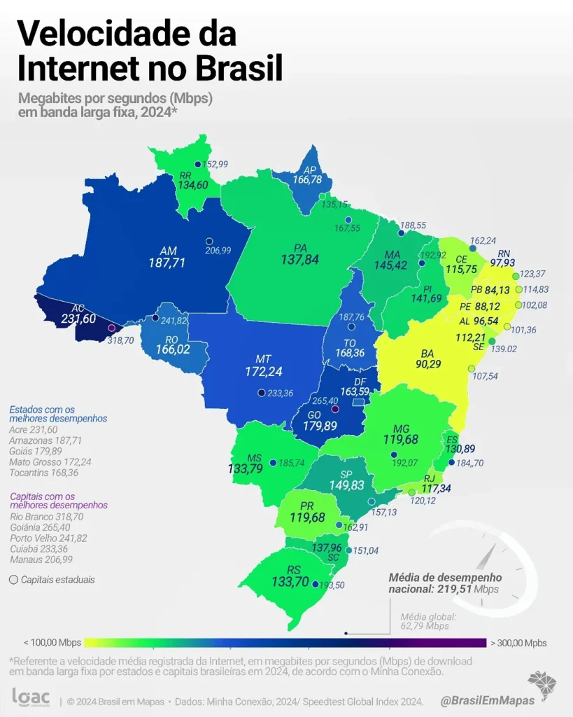 A velocidade média da internet no Brasil atingiu 219,51 Mbps em 2024, representando um crescimento expressivo de 277% em relação a 2021, quando a média nacional era de 58,18 Mbps.
