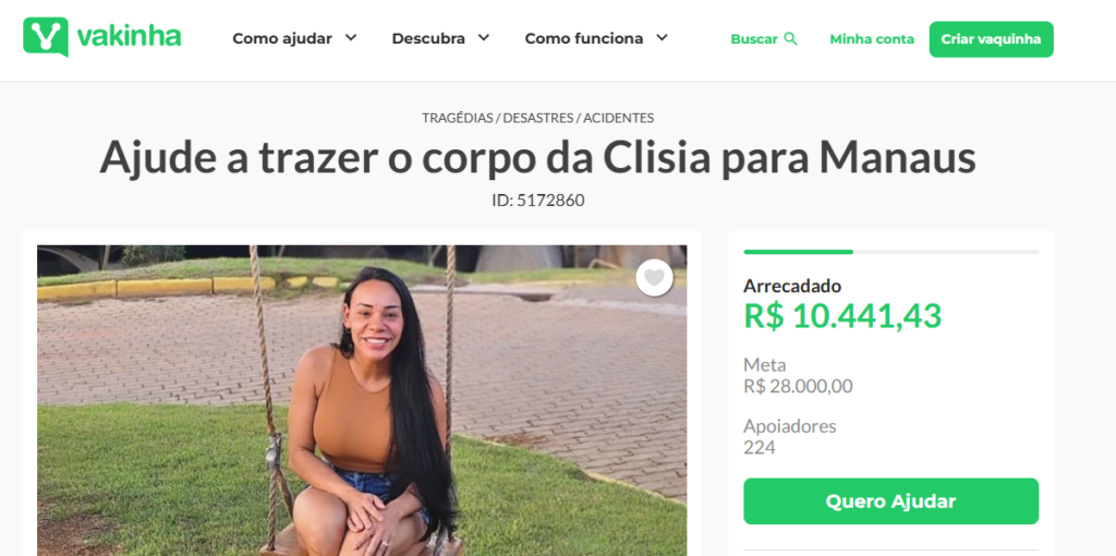A família de Clísia organiza uma vaquinha virtual para fazer o translado do corpo de Clísia para Manaus e precisa de R$ 28 mil reais. https://www.vakinha.com.br/vaquinha/ajude-a-trazer-o-corpo-da-clisia-para-manaus?