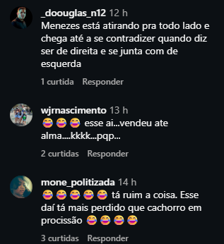 Em um dos comentários, um internauta escreveu. “Menezes está atirando para todo lado e chega até a se contradizer quando diz ser de direita e se junta com a esquerda”.
