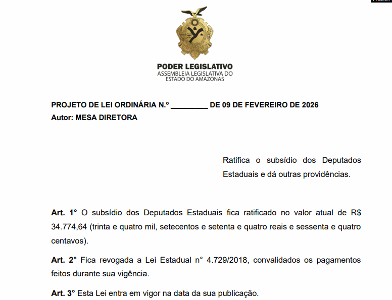 Com o Projeto de Lei 62/2026, a Aleam quer revogar a regra de 2018, fixar o valor atual do salário e exigir que qualquer reajuste futuro seja aprovado por nova lei da própria Casa. O texto também valida os pagamentos já feitos.