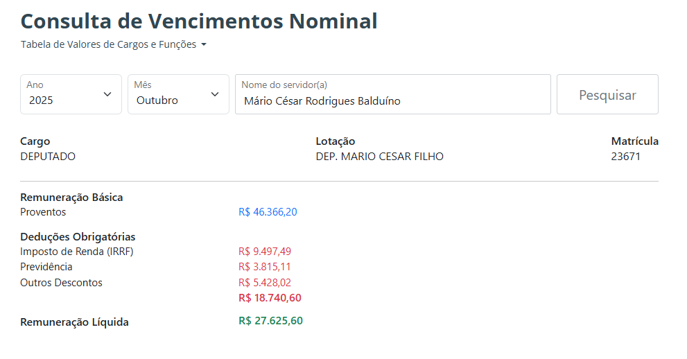 Em consulta ao Portal da Transparência da Aleam, é possível verificar que os salários dos deputados chegam a R$ 46,3 mil, valor igual ao do presidente da República.
