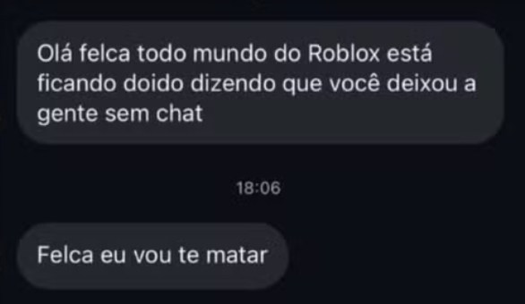 Em uma das mensagens divulgadas, o autor escreve: “Todo mundo do Roblox está ficando doido, dizendo que você deixou a gente sem chat” e, em seguida, “Felca, eu vou te matar” em um outro trecho.