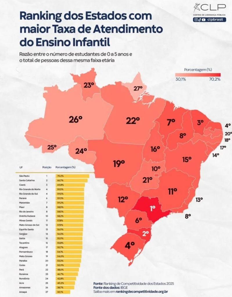 O Amazonas aparece como o segundo pior estado do país em qualidade da educação no quesito Taxa de Atendimento da Educação Infantil, segundo dados divulgados em janeiro de 2026 pelo Centro de Liderança Pública (CPL Brasil).