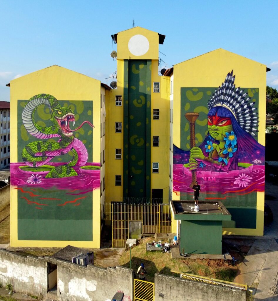 O artista André Hullk, um dos criadores do projeto, contou que o objetivo da pintura, que durou sete dias para ficar pronta, é homenagear a história de uma das primeiras mulheres indígenas escolhidas para liderar seu povo em Peruíbe, no litoral sul de São Paulo. Gnos, outro responsável pela pintura destacada nas construções, explica que a arte celebra a mitologia Amazônica, reverenciando a cultura ancestral sobre a fauna e flora.