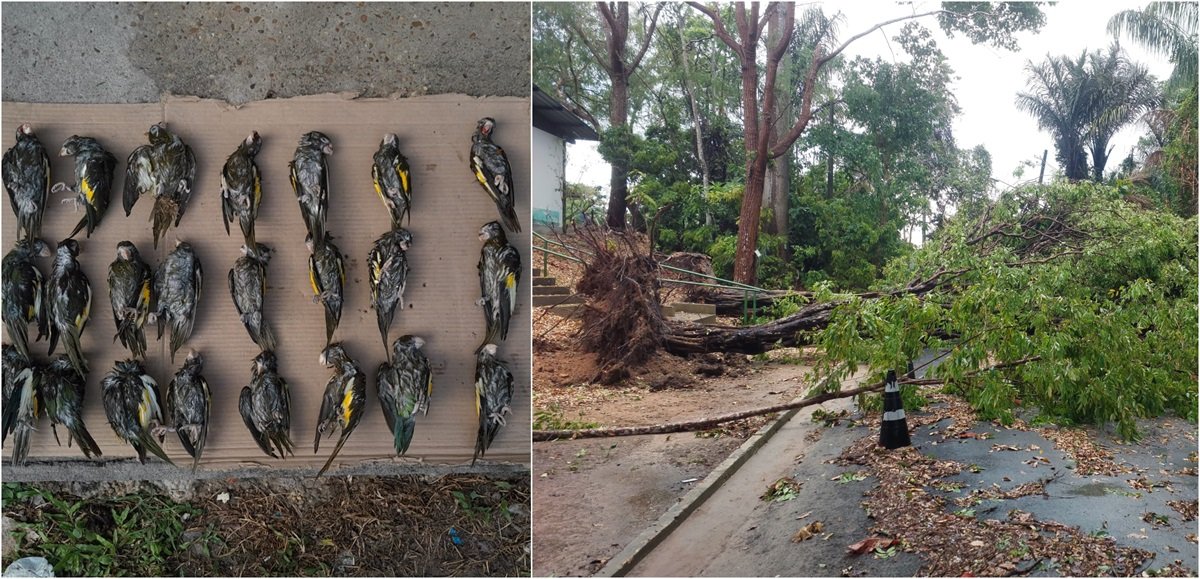 As aves que viviam nas matas do campus morreram com o temporal, são 20 periquitos foram encontrados caídos nas dependências da universidade.