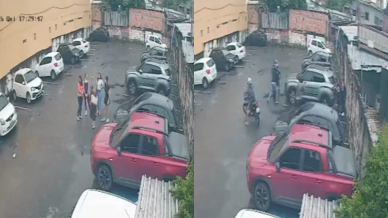 MANAUS (AM) – Um grupo de mulheres foi assaltado na tarde desta quinta-feira, 26/2, no estacionamento de uma faculdade particular, localizada no bairro Adrianópolis, zona Centro-Sul de Manaus. A ação criminosa foi registrada por câmeras de vigilância.