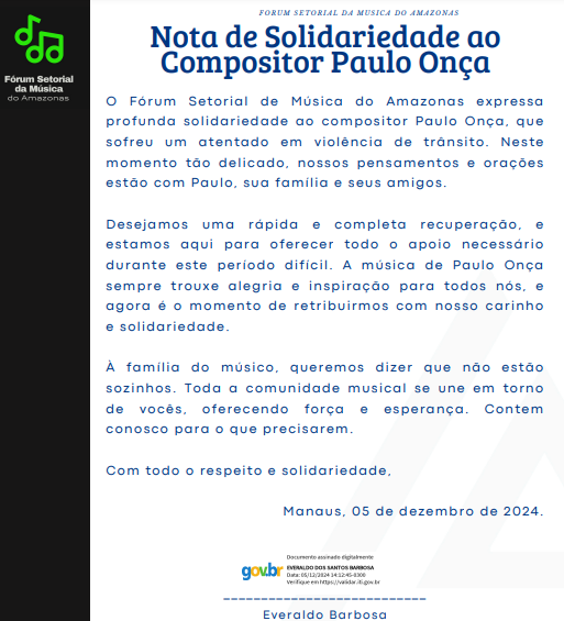 O Fórum Setorial de Música do Amazonas, que integra o Sistema Nacional e Estadual de Cultura e atua promovendo discussões relevantes para a música e a cultura local, emitiu uma nota oficial de solidariedade ao compositor nesta quinta-feira.