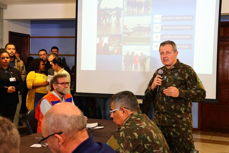 “Podemos aumentar o efetivo com militares do Paraná e Santa Catarina, além do Rio Grande do Sul. Na medida em que for necessário, deslocaremos nossos meios para reforçar ainda mais as ações, para levar socorro rápido e ágil à população”, disse General Tomás.