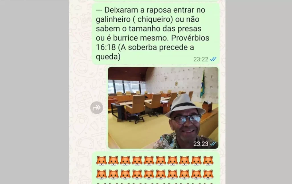 BRASÍLIA (DF) – O autor do ataque a bombas na Praça dos Três Poderes, Francisco Wanderley Luiz, visitou, meses antes, o Supremo Tribunal Federal (STF), e tirou uma selfie no plenário da Corte. “Deixaram a raposa entrar no galinheiro”, comentou. A ida foi no dia 24 de agosto.