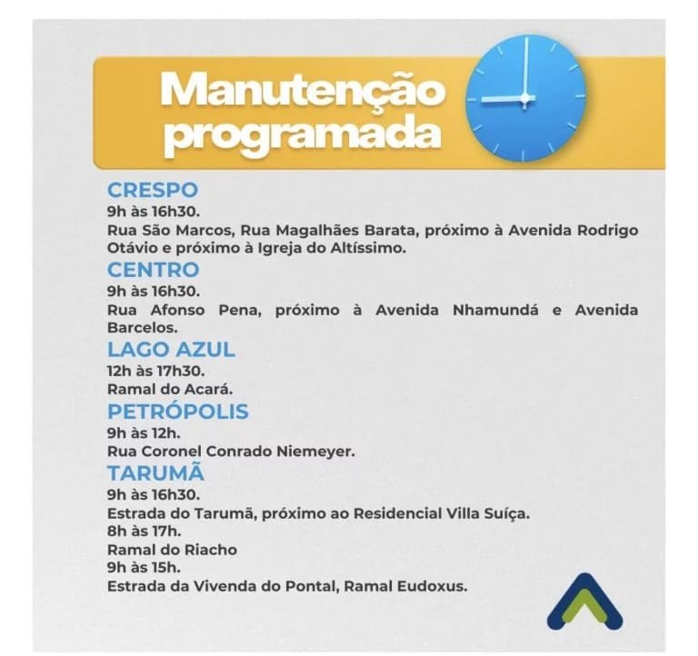 MANAUS (AM) – Moradores e comerciantes das zonas Norte, Sul, Oeste e do Centro de Manaus vão ficar sem energia elétrica, nesta quinta-feira, 11/7. Os bairros são Lago Azul, Cidade de Deus, Petrópolis, Crespo, Tarumã e área central.
