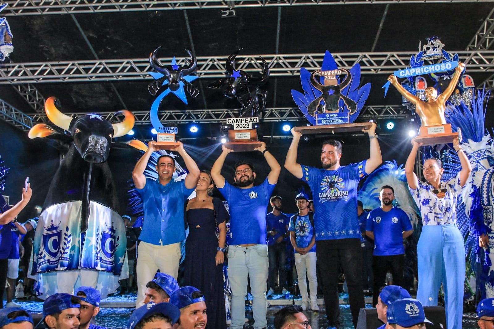 O presidente do Boi Caprichoso, Rossy Amoedo, destacou a importância do momento, reconhecendo o trabalho incansável de todos que contribuíram para a vitória do bumbá.