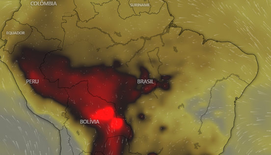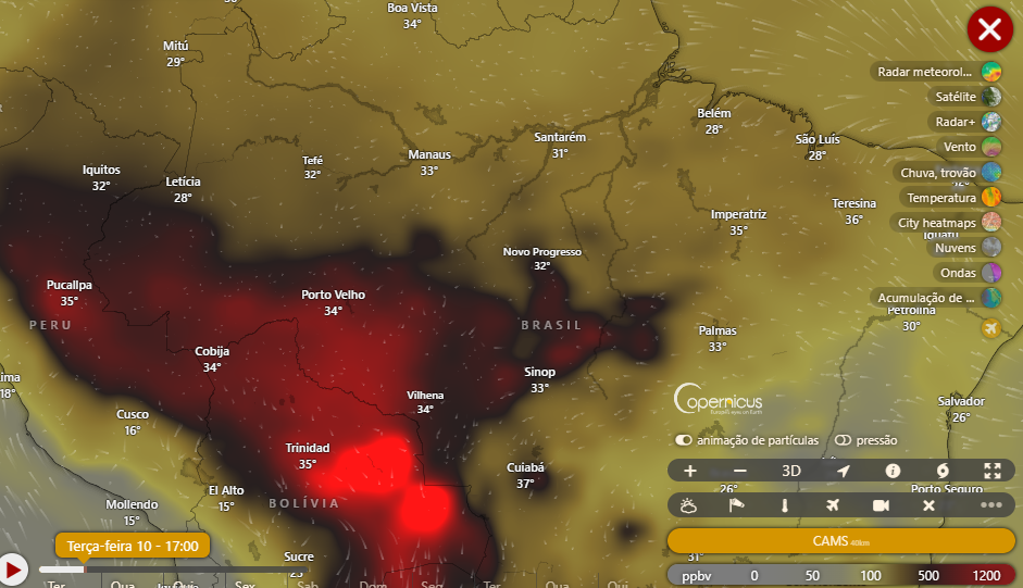 É possível notar uma grande mancha de fogo avançando sobre a Amazônia e parte do Cerrado, conforme identificado pelo satélite europeu Copernicus. Nesta terça-feira, 10/9, essa situação ficou mais evidente através do radar Windy.com.