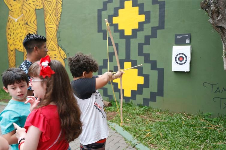 Brincadeiras guaranis para crianças no Museu das Culturas Indígenas – (Foto Paulo Pinto/Agência Brasil)