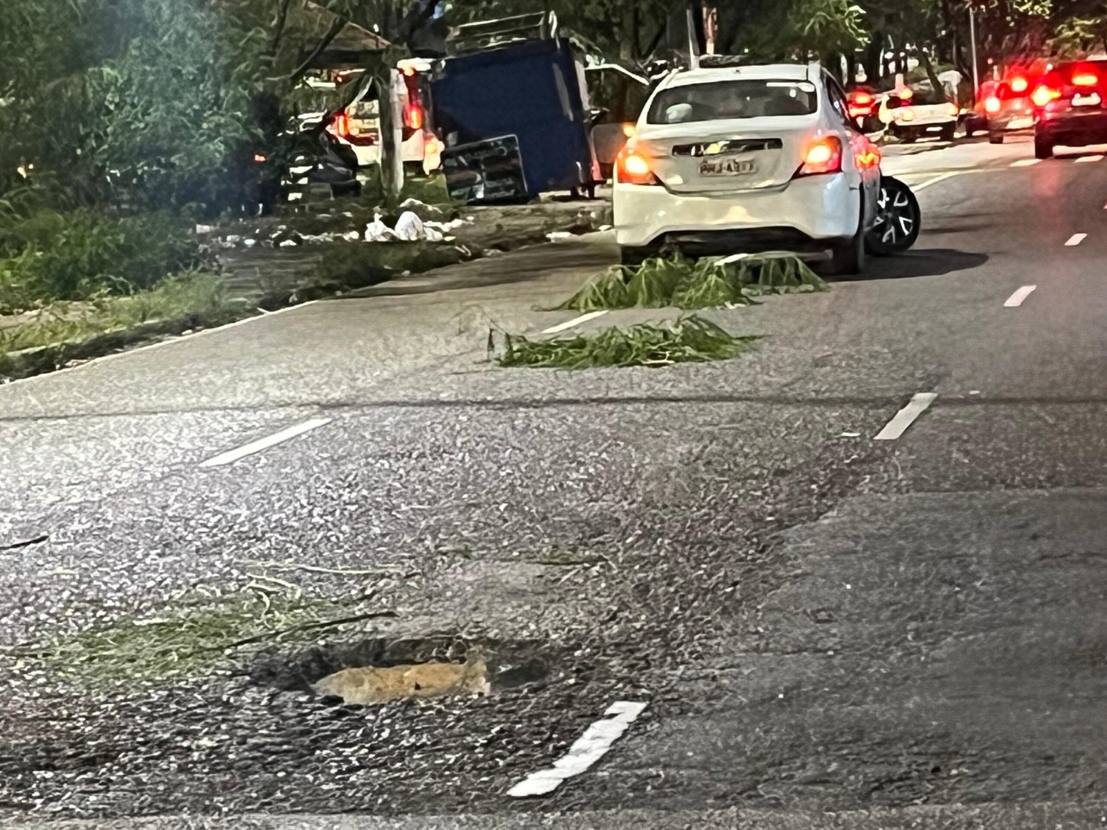De acordo com a motorista, ela precisou escolher entre bater no carro ao lado ou entrar no buraco. “É triste a gente ver um negócio desse, em plena avenida principal”, informou.