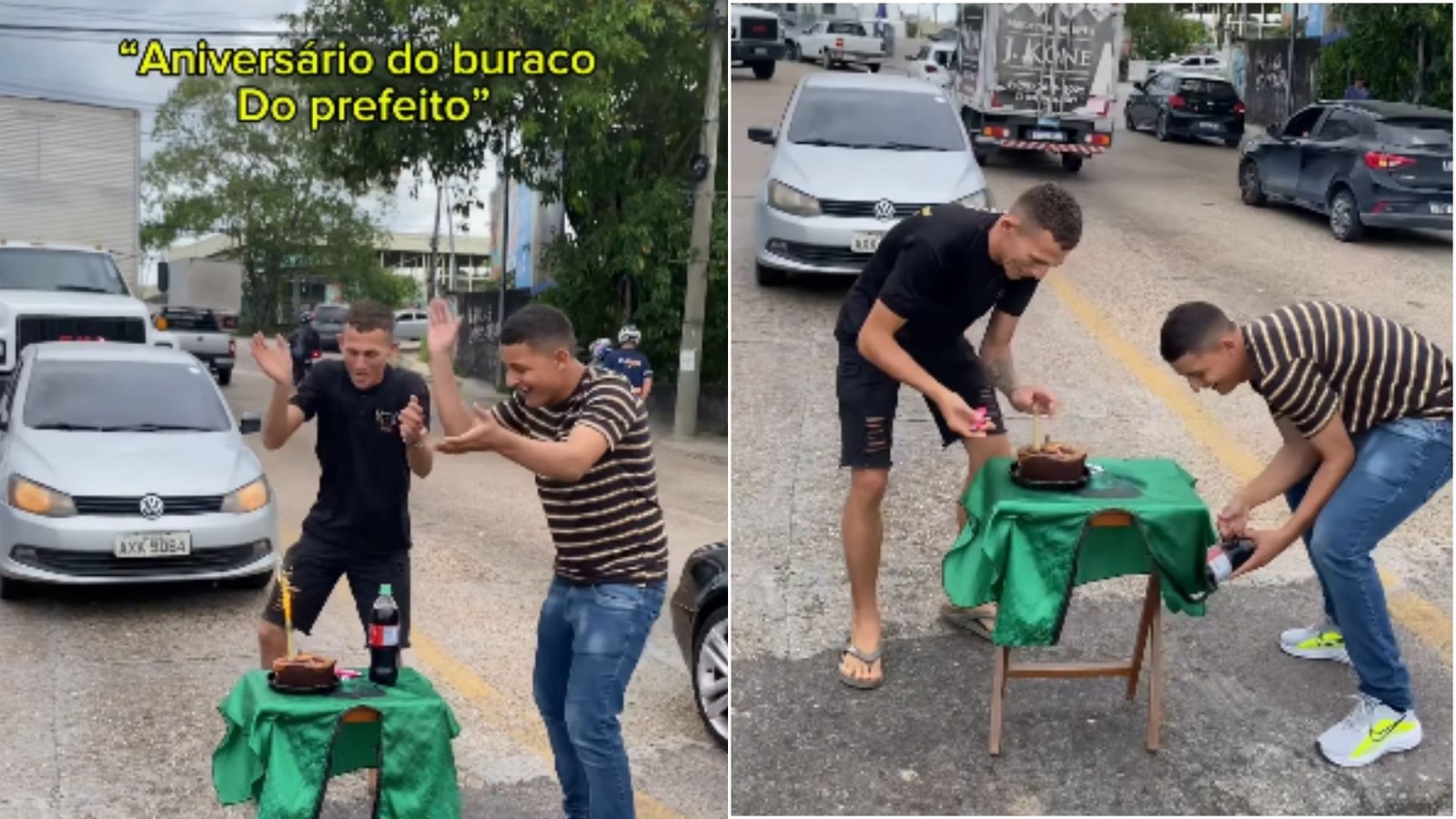 MANAUS (AM) – Os influenciadores Vitor Freitas e Modric publicaram um vídeo nas redes sociais, nessa quinta-feira, 5/3, comemorando de forma irônica o “aniversário” de um buraco na rua Waldomiro Lustoza, localizada no bairro Japiim, zona Sul de Manaus.