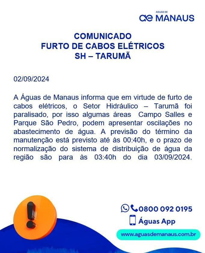 Desde o furto dos cabos, o setor hidráulico da concessionária, situado na área do Tarumã, também na zona Oeste da cidade, foi paralisado, afetando o abastecimento nos dois bairros. A empresa é responsável pelos serviços de água, coleta e tratamento de esgoto da capital amazonense.