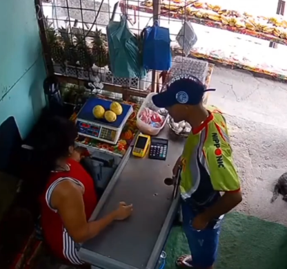 Ele mandou a comerciante se ajoelhar enquanto vasculhava o que tinha ainda no caixa. O criminoso estava de boné, bermuda jeans e uma camisa de time.
