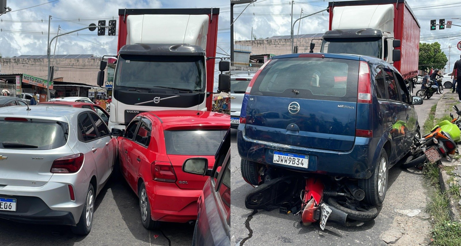 Pessoas que passavem pelo local registraram o momento da colisão do caminhão com os veículos. Até o momento, não há informações sobre feridos.