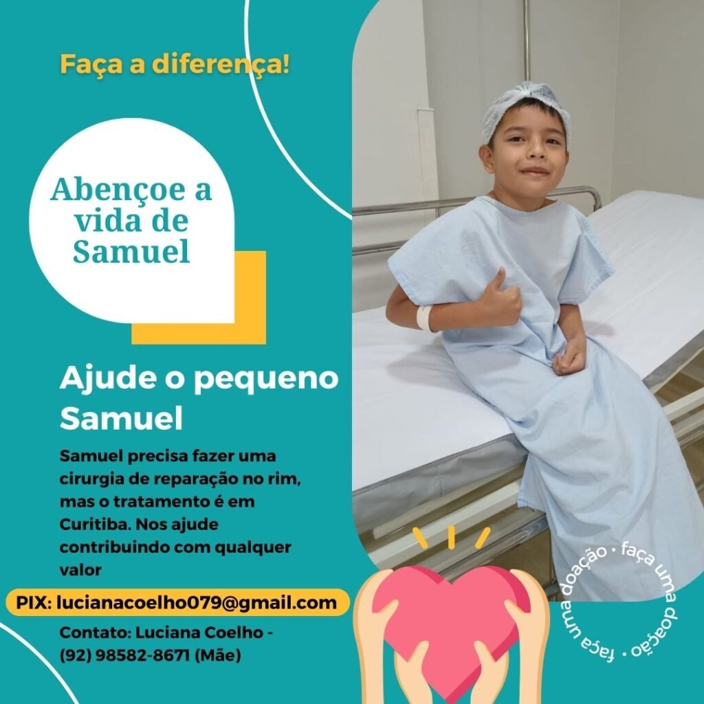 Luciana Coelho, mãe de Samuel, explicou a situação para conseguir realizar a cirurgia. “Estamos fazendo uma vaquinha para custear a viagem. Meu filho, no meio do ano, ao passar por uma cirurgia no testículo, foi diagnosticado com uma dilatação no rim esquerdo. Ele precisa de uma correção urgente”, explicou.