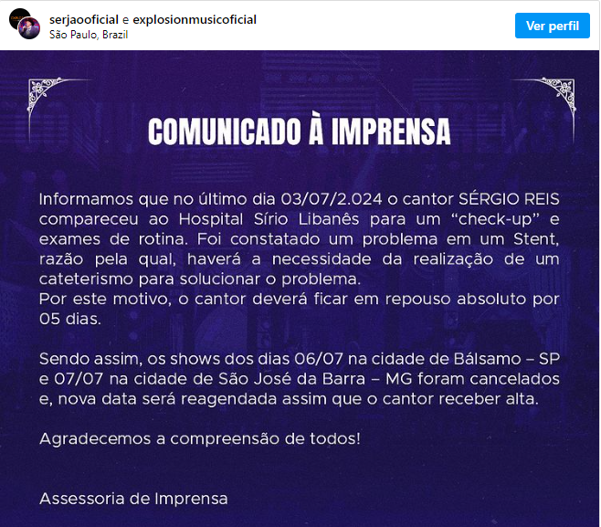 Após a divulgação do indiciamento do cantor sertanejo, ele emitiu nota afirmando que desde quarta-feira, 3/4, está internado no Hospital Sírio Libanês para fazer um cateterismo por conta de problema em um Stent [um pequeno dispositivo inserido no interior de uma artéria para prevenir ou evitar a obstrução do fluxo no local pelo acumulo de gordura].