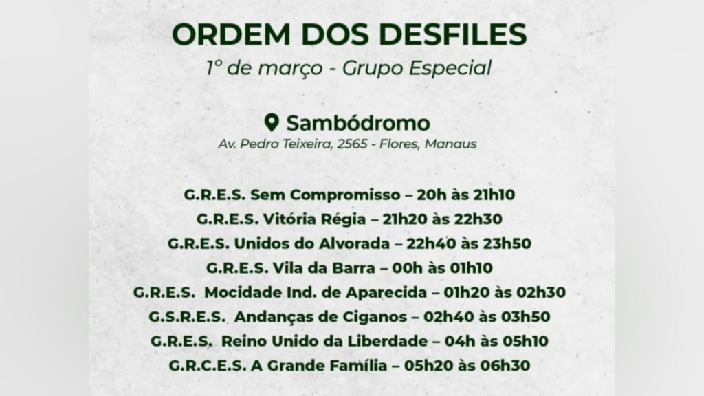 O desfile acontecerá no dia 1º de março de 2025, no Sambódromo de Manaus, localizado na avenida Pedro Teixeira, bairro Chapada, zona Centro-Sul de Manaus. Cada uma das escolas terá uma hora e dez minutos para se apresentar.