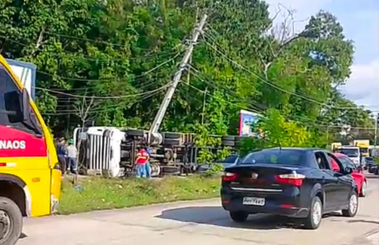 MANAUS (AM) – Uma carreta tombou na tarde desta quarta-feira, 15/10, no final da avenida Buriti, Distrito Industrial, zona Sul de Manaus, nas proximidades da Bola da Suframa.