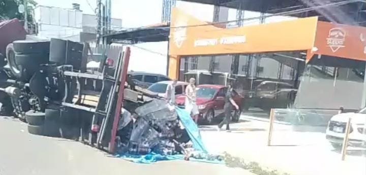 Carreta tomba e espalha refrigerantes em avenida na zona Sul de Manaus