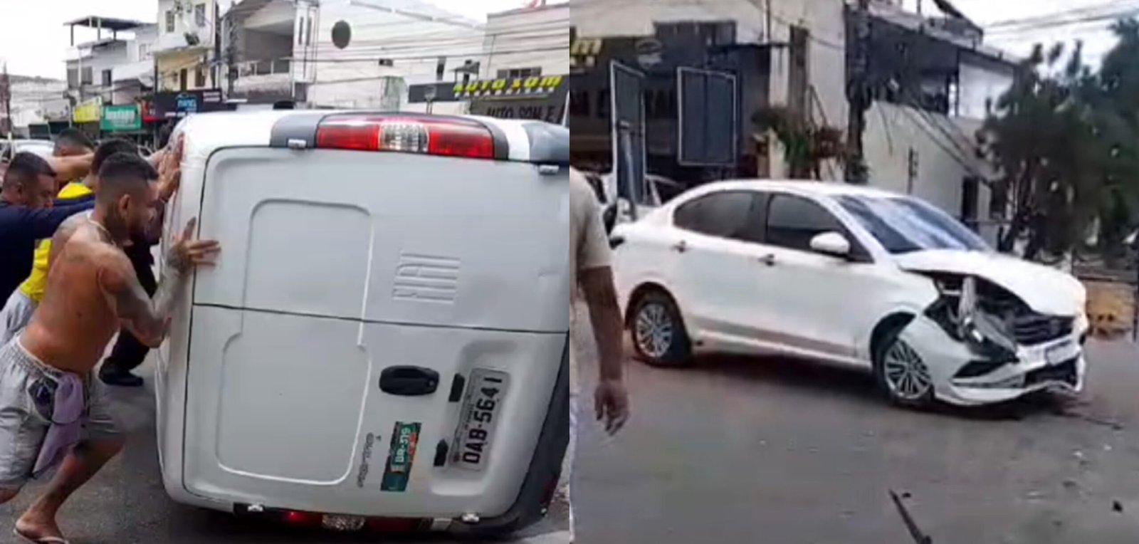 Os vídeos do acidente circularam nas redes sociais. A colisão foi entre um furgão, modelo fiat e um carro de passeio. Depois do impacto, dois homens que estavam em dos carros saíram sem ferimentos graves.