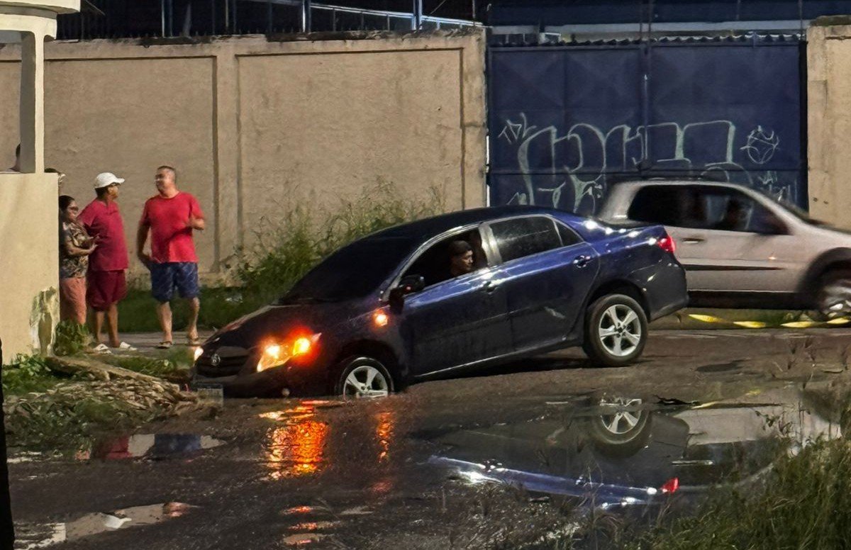 MANAUS (AM) – Um carro ficou preso em um buraco enquanto trafegava pela rua Queen Odyssey, no Conjunto Canaranas, bairro Cidade Nova, zona Norte de Manaus. O caso foi registrado nesta semana, durante a noite.
