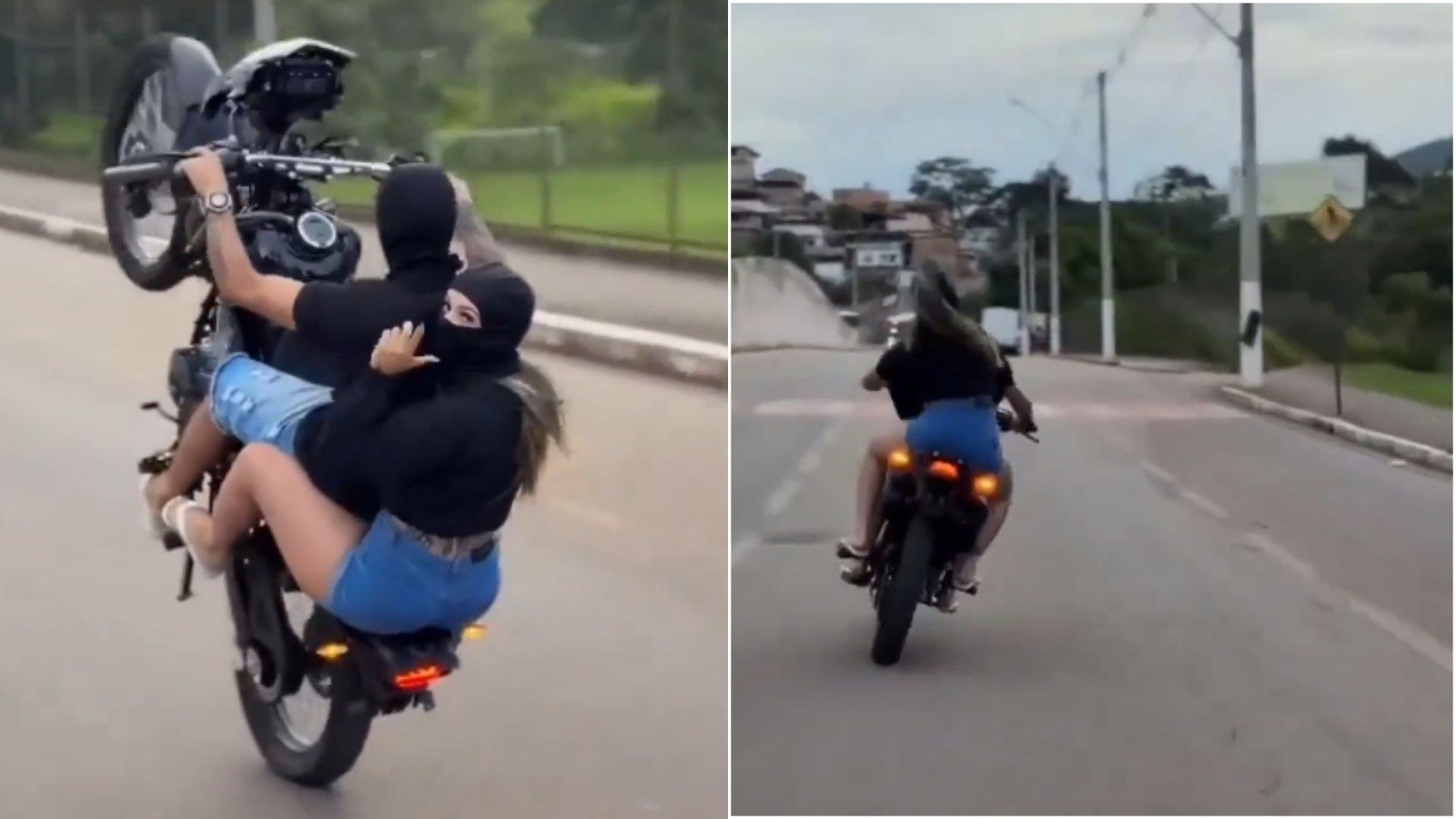 Segundo os registros, os dois aparecem usando máscaras enquanto o motociclista levanta a parte dianteira da moto e segue em alta velocidade pela rua. Segundos depois, ele perde o controle do veículo e os dois acabam caindo no asfalto.
