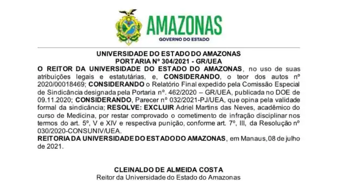 A reportagem do Portal RIOS DE NOTÍCIAS identificou que o profissional envolvido no caso, Adriel Martins das Neves, já foi expulso do curso de Medicina da Universidade do Estado do Amazonas (UEA) em 2021 por falta disciplinar grave. Segundo a instituição, ele não concluiu a graduação e não possui diploma médico.