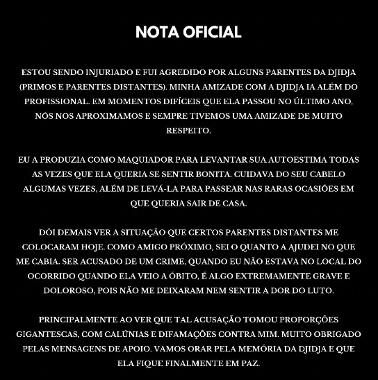 Na última terça-feira, 28/5, em vídeo que viralizou nas redes socias, Marlisson aparece sendo agredido e acusado pela família de Djidja. Os parentes estavam revoltados e acusando o cabeleireiro de ser responsável pela morte de Djidja. Em meio as acusações, uma mulher chama um jovem de “drogado” e diz que ele será “responsabilizado por isso”.