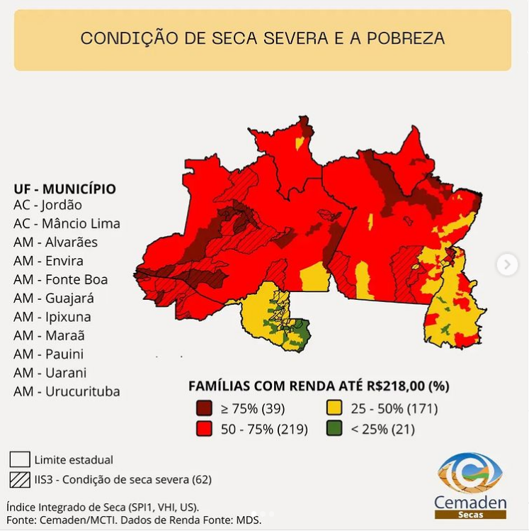 De acordo com o Centro Nacional de Monitoramento e Alertas de Desastres Naturais, a seca severa continua causando impactos na região Norte do país. Dados divulgados no dia, 19/7, mostravam que em nove municípios do Amazonas e dois no Acre, mais de 75% das famílias vivem com renda abaixo de R$218,00 e enfrentam a condição de seca severa.