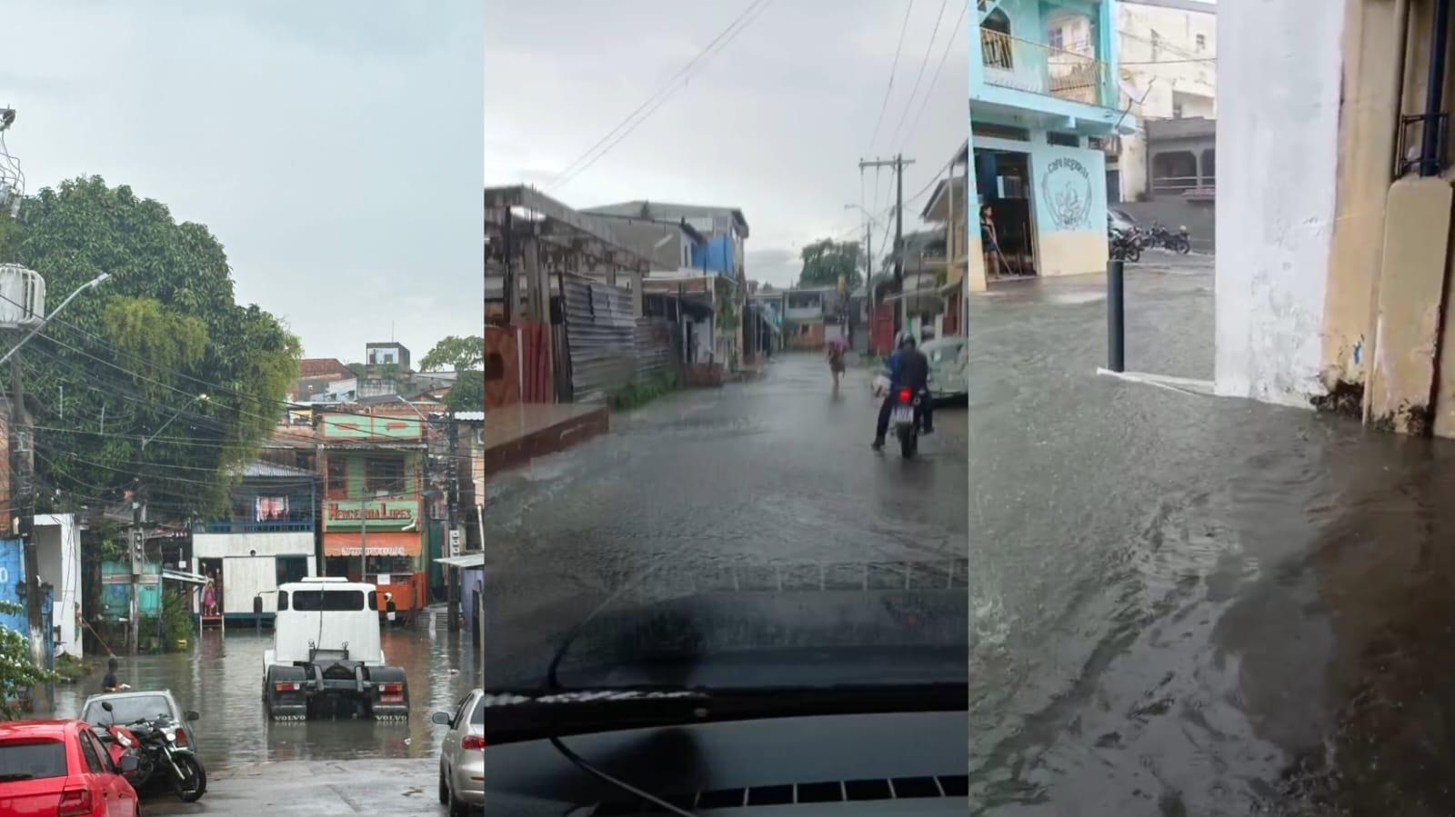 Vídeos compartilhados nas redes sociais mostram pontos completamente alagados, dificultando o tráfego de veículos e a circulação de pedestres