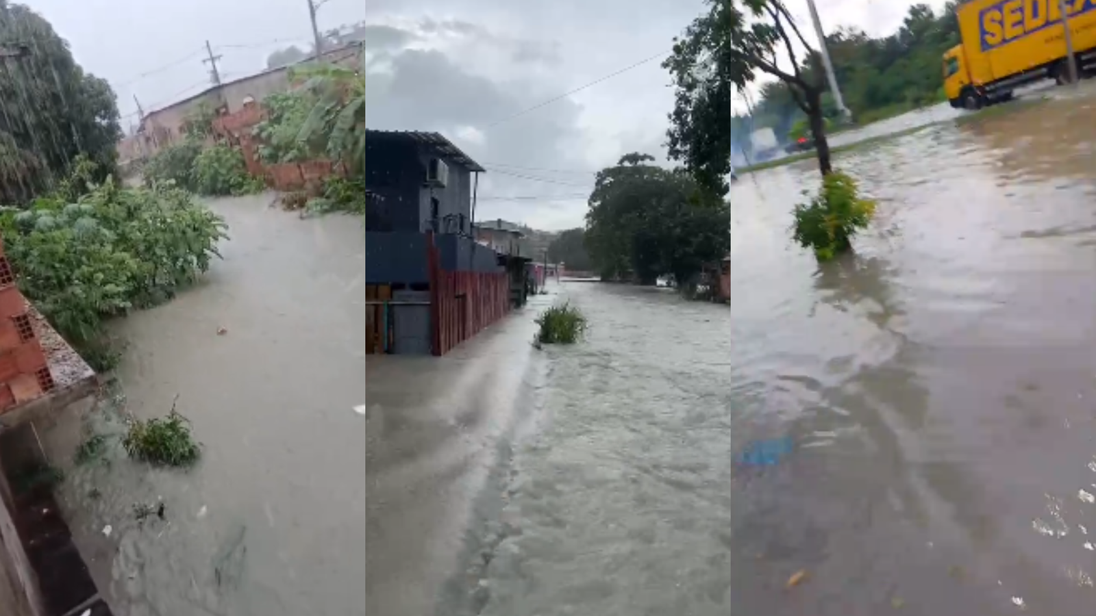 Em vídeos que circulam nas redes sociais, é possível ver a avenida Nathan Xavier, no bairro Novo Aleixo, na zona Norte, completamente tomada pela água, onde os motoristas precisam se arriscar para passar pela via.