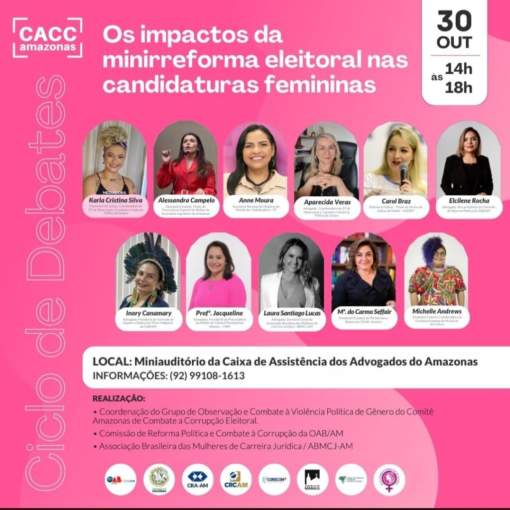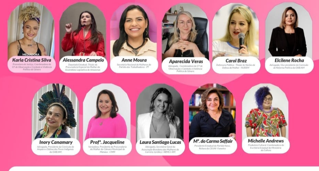 O tema será conduzido pela advogada Aparecida Veras, da coordenação do Grupo de Trabalho (GT) de Observação e Combate à Violência Política de Gênero, pela produtora cultural Michelle Andrews, que é coordenadora do Escritório estadual do Ministério da Cultura, pela promotora de Justiça Karla Cristina Silva, da Coordenadoria do GT de Observação e Combate à Violência Política de Gênero, pela Secretária Nacional de Mulheres do Partido dos Trabalhadores – PT, Anne Moura, pela advogada Inory Canamary, que preside a Comissão de Amparo e Defesa dos povos indígenas da OAB-AM, pela presidente estadual do partido Novo e Reitora da Fametro, Maria do Carmo Seffair, pela defensora pública Carol Braz, que é titular do Núcleo de Defesa da Mulher-NUDEM; pela vereadora Professora Jacqueline, presidente da Procuradoria da Mulher da Câmara Municipal de Manaus, pela deputada estadual Alessandra Campelo, que é membro da Procuradoria Especial da Mulher da ALE-AM, pela advogada Elcilene Rocha, Vice-Presidente da Comissão de Reforma Política da OAB-AM e pela advogada Laura Lucas Santiago, responsável pela Secretaria Geral da ABMCJ-AM.